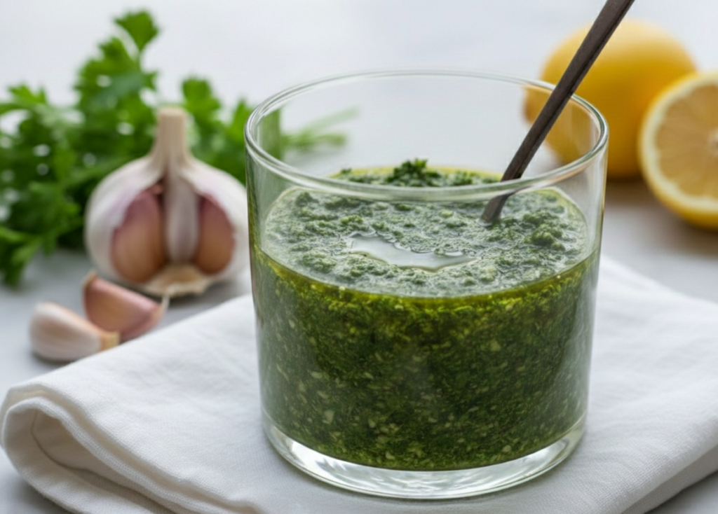 Ergänze das Rezept um einen Teelöffel getrockneten Oregano und einen Esslöffel Rotweinessig. Diese argentinische Note macht die Sauce zum ultimativen Partner für ein saftiges Steak.